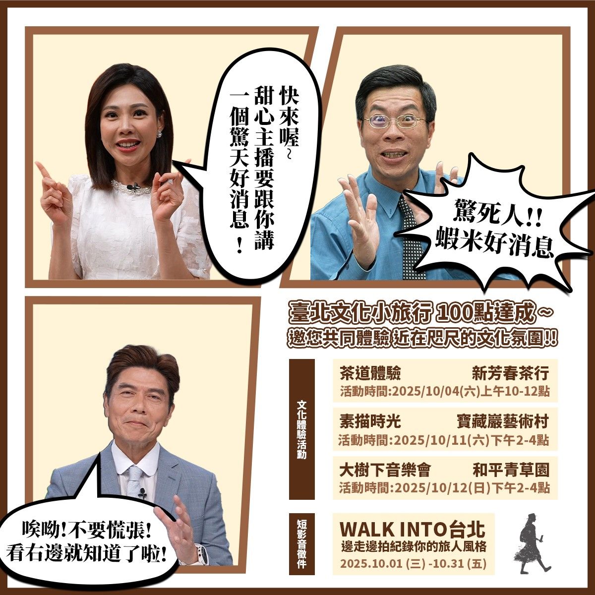 文化局為了持續深化臺北文化小旅行「WALK INTO」的核心精神,精心策劃一場短影音徵件活動,徵件時間於即日起至10月31日止,報名對象不限年齡與國籍,凡對「臺北文化小旅行100處文化點」有興趣之民眾,皆可參加個人組或團體組,但不可跨組報名,此外投稿作品需先上傳至個人社群平臺(Yt、Fb、Ig、Threads等)影片Hashtag臺北文化小旅行,並設定公開分享取得網頁連結,再將連結填入活動報名系統,後續作品將依「影像魅力」、「創意風格」與「文化共鳴」三大面向進行評選,獲選作品將於11月24日後公布結果,除了豐富的獎項,更有機會於文化局及鏡電視社群平臺公開露出,詳情請參見活動辦法。