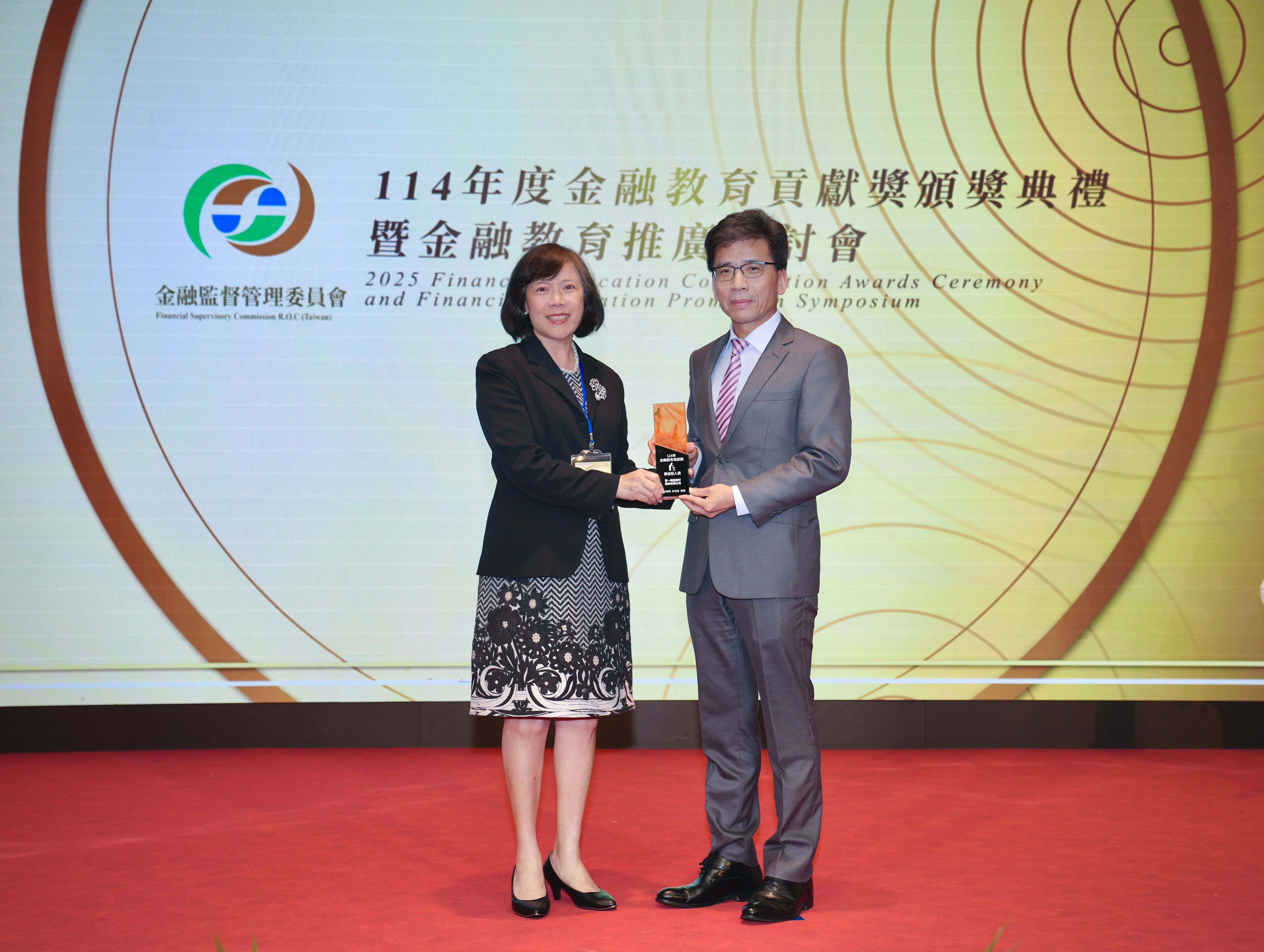 第一銀行以實際行動展現對金融教育的重視與承諾,今年再度榮獲金融監督管理委員會頒發「金融教育貢獻獎–最佳投入獎」殊榮,提升全民金融素養與防詐意識的卓越成效備受肯定,10月29日由第一銀行副總經理蔡淑慧代表受獎。