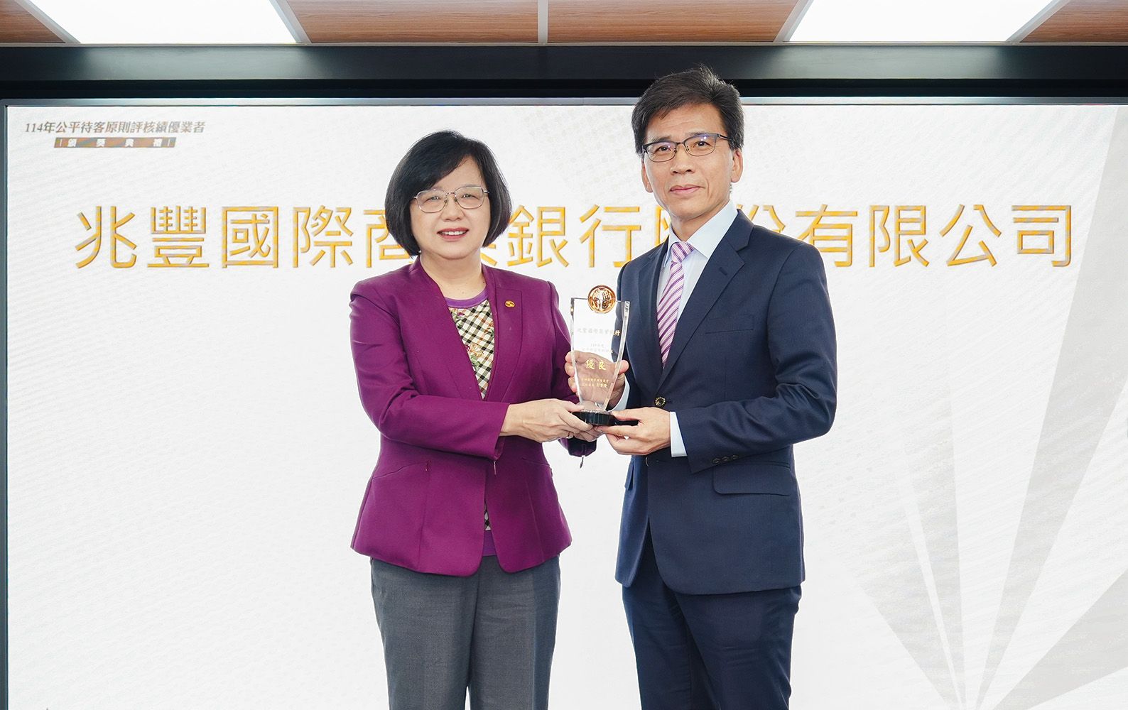 兆豐銀行貫徹待客如親,服務用心的核心服務理念,在推動公平待客原則與金融友善服務上不遺餘力,於11月4日獲頒金管會114年度「金融服務業公平待客原則評核」績優獎項,展現兆豐銀行在金融消費者保護與公平待客服務上的卓越成果。