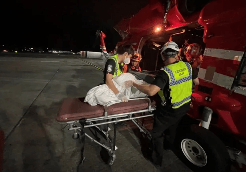巴拿馬籍麗星郵輪「探索星號」昨(13日)航行於花蓮外海時,一名台籍男性旅客在船上浴室跌倒失去意識,空勤總隊花蓮駐地獲報後,派遣黑鷹直升機前往救援,以吊掛方式將傷患送至花蓮機場,再由救護車轉送醫院治療。