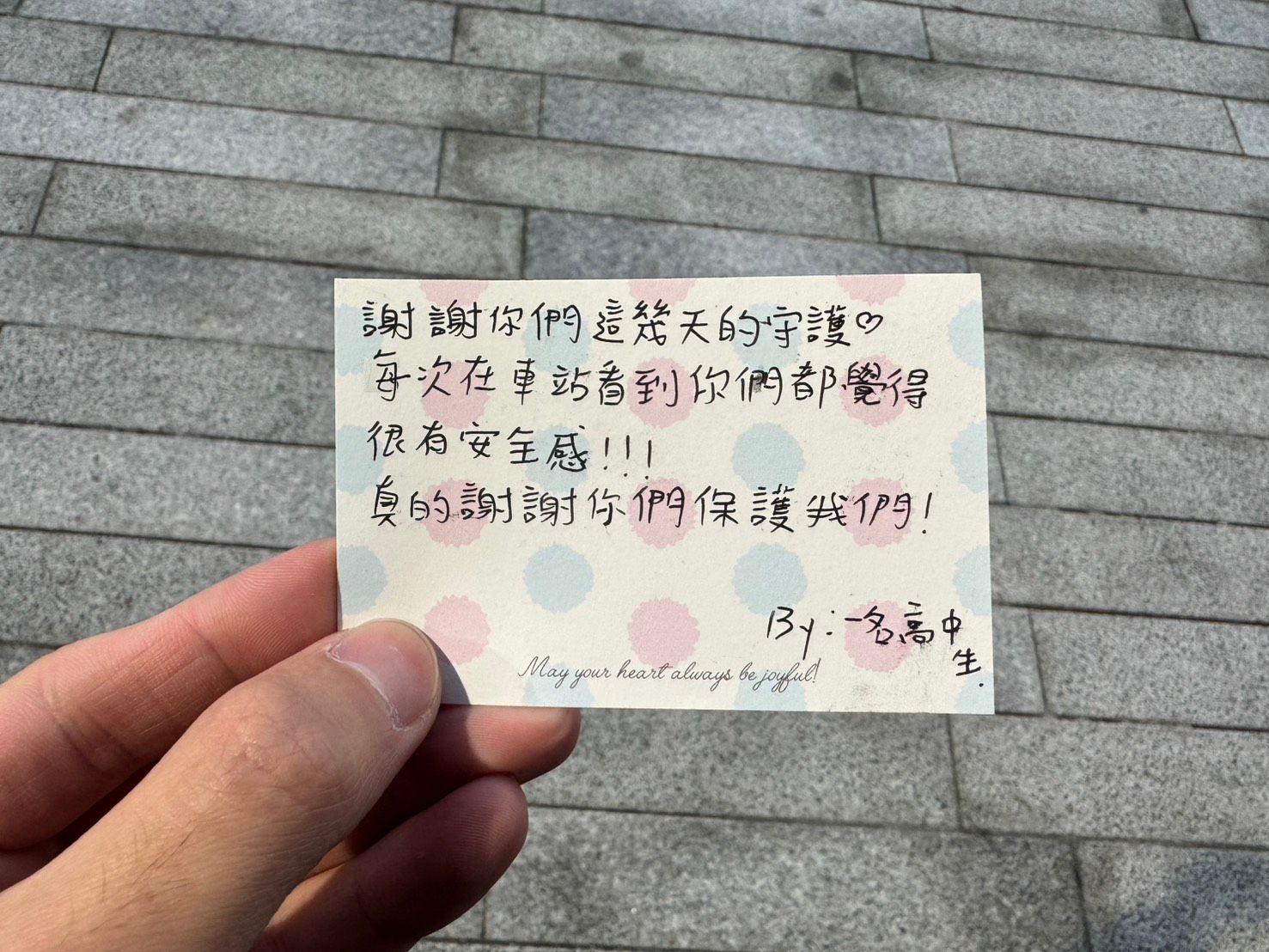 隨機攻擊事件發生後,網路出現部分疑似「模仿犯罪」的恐嚇言論,全國警方近期均加強戒備,在人潮眾多的地點駐守,嚴防任何危安事件再次發生。台南市政府警察局永康分局昨(24日)在臉書分享民眾的暖心舉動,警方表示,在車站值勤時收到一名高中生的手寫卡片,內容提到「謝謝你們這幾天的守護,每次在車站看到你們都覺得很有安全感,真的謝謝你們保護我們!」讓他感到暖心,直呼「這絕對是聖誕平安夜收到最溫暖、最有感的禮物」。