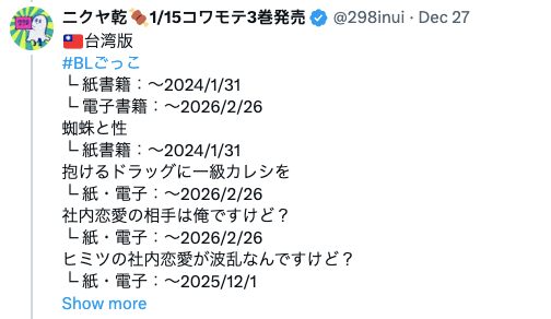 日本知名BL漫畫家ニクヤ乾,原訂明年2月7日來台舉行簽名會,不過近日卻因兩岸認同遭炎上,他在社群宣傳中文版作品時,使用中國五星旗,直播時還清楚指出,知道自己的作品在中國買不到,但在「某個國家」能買到,避談台灣讓粉絲怒火延燒,事後作者雖更換國旗並道歉仍難止血,今(29日)台灣出版商出面宣布取消簽名會。