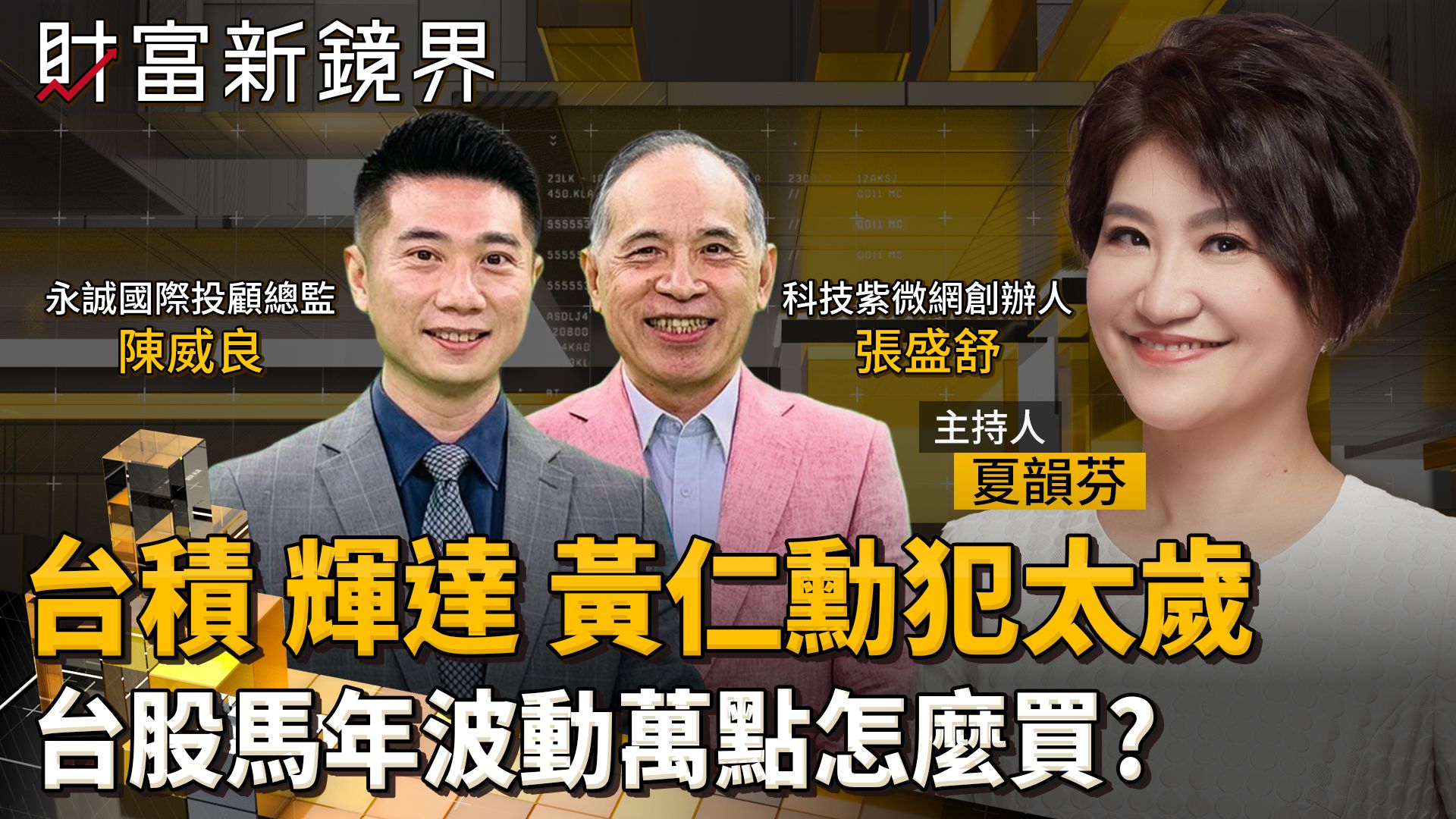 黃曆來到天干地支都屬火的丙午火馬年,加上明年丁未「紅羊年」,是命理上60年一遇的「赤馬紅羊劫」,馬年包括台積電、輝達、黃仁勳都犯太歲,在這火氣最旺、動盪最劇烈的週期,各機構預估台股震盪高低差可達一萬點以上,投資人該如何趨吉避凶,以生財有術渡過劫數,轉化成為財富逆增上緣?來看《財富新鏡界》主持人夏韻芬與命理大師張盛舒、股市全威陳威良分析師精彩對談。