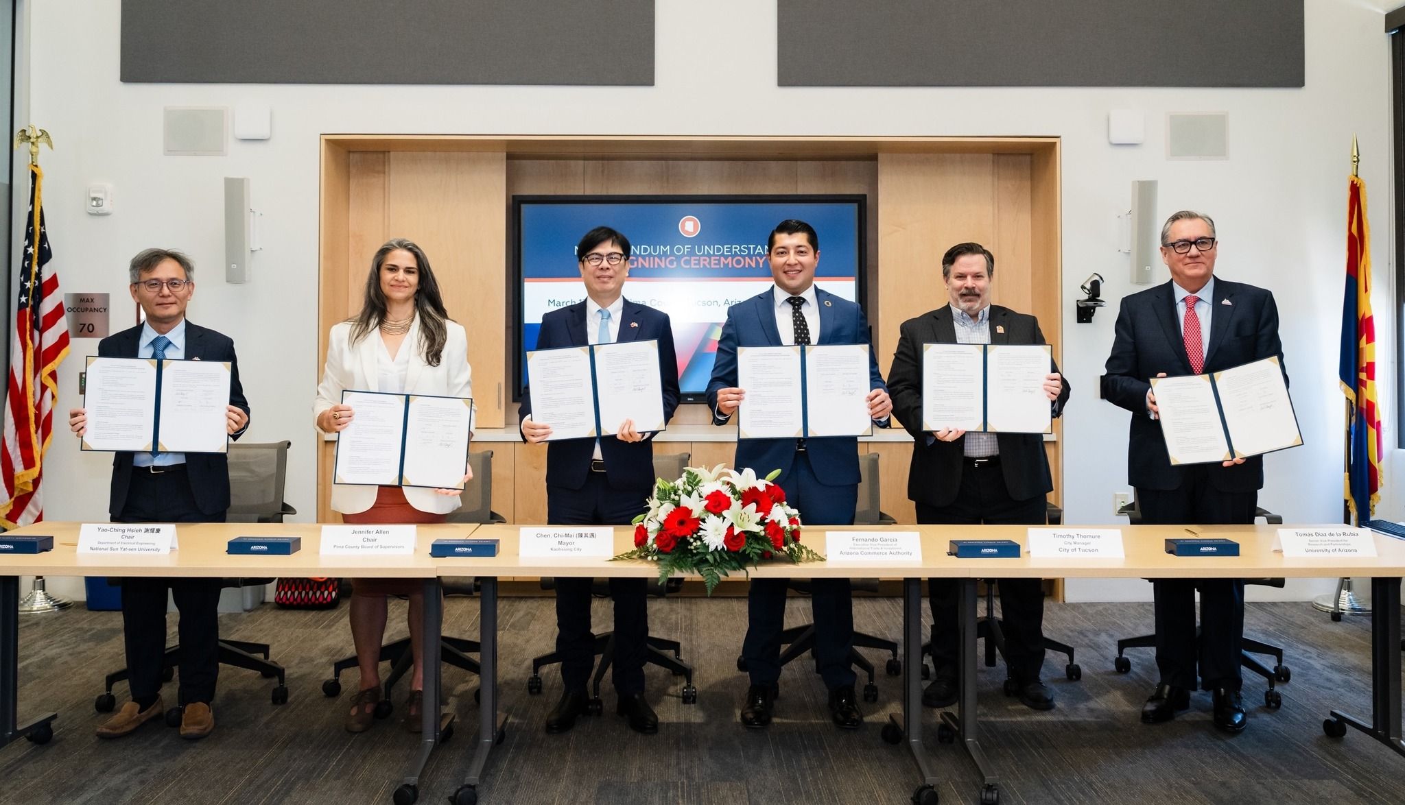 陳其邁率市府團隊與日本熊本縣訪團訪美行程馬不停蹄,繼與亞利桑那州政府及日本熊本縣簽署三方MOU後,再前往亞利桑那州第二大城、被譽為「光學之谷」的土桑市,與亞利桑那州商務廳、皮馬郡、土桑市政府、亞利桑那大學及國立中山大學共同簽署「六方半導體生態系與全球人才夥伴合作備忘錄」,進一步深化台美產官學合作,推動跨國半導體人才培育與產業交流。