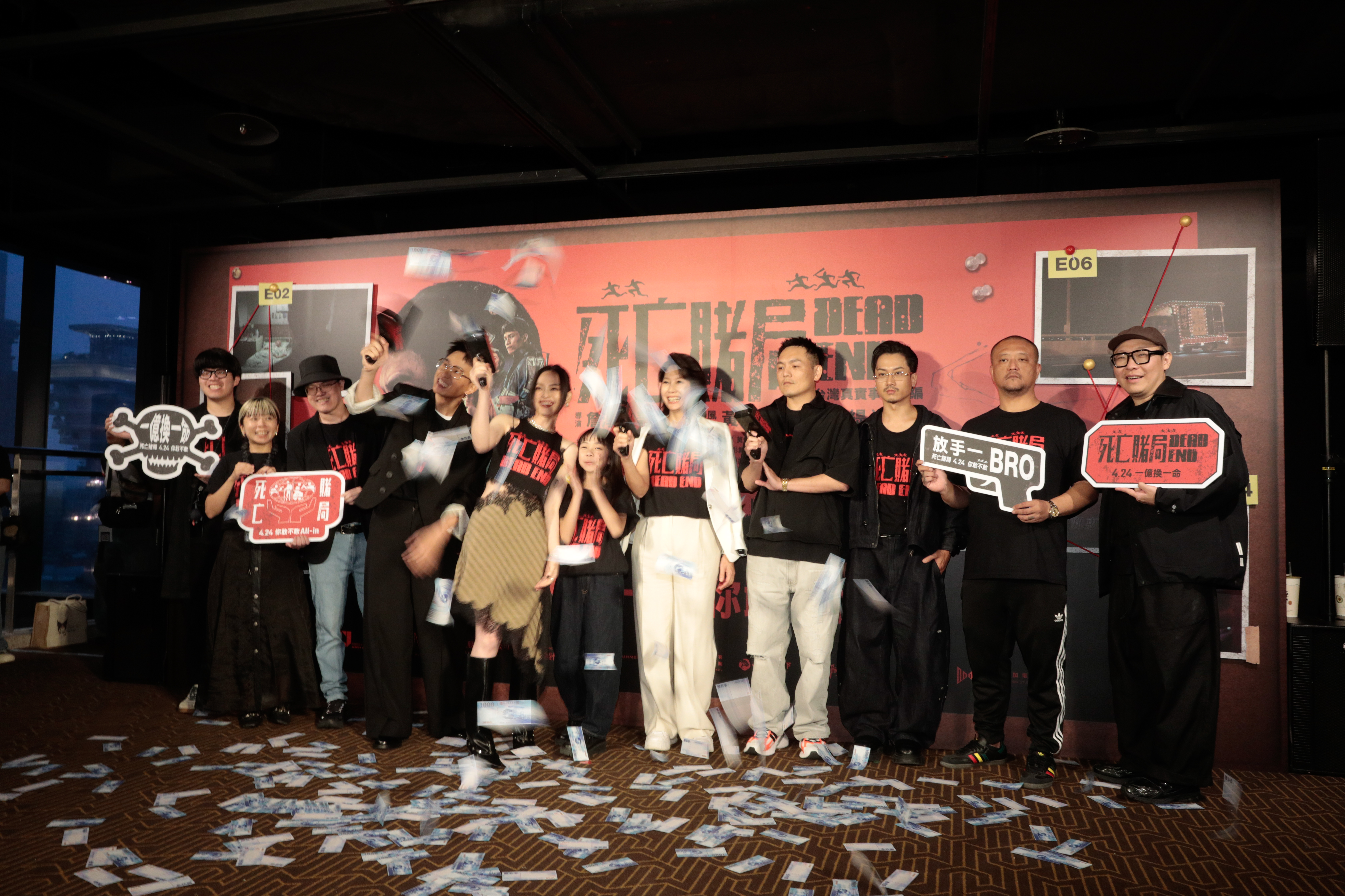 首映會上主演陣容春風(洪瑜鴻)、黃奇斌(阿斌)、丁寧、姚以緹、游薇琳、五木首度全員合體,並且一起開槍「狂撒幣」,現場賭局氣氛嗨到最高點。近期跨足影視圈頗有成績的黃奇斌,這次在電影中與春風飾演手足,兩人的相知相惜感動不少試映觀眾,甚至有人以「哭到淅瀝嘩啦」來形容片中兩人逃亡的橋段。談到與春風首度跨刀合作的主題曲,阿斌忍不住笑虧哥哥春風根本是劇組的「社群總監」,甚至還在宣傳期「偷跑」發布MV截圖。雖然互相吐槽,但兩人對這支首度合作的音樂作品都感到非常滿意。